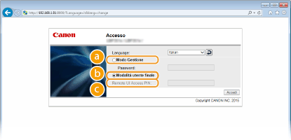 È possibile eseguire tutte le operazioni e impostazioni della IU remota. Immettere la password del Gestore sistema in [Password].