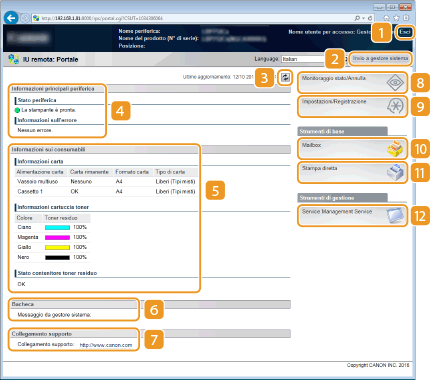 Visualizza un messaggio del Gestore sistema specificato in [Bacheca/Collegamento supporto], sotto [Impostazioni/Registrazione]