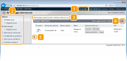 Visualizza la pagina [Monitoraggio stato/Annulla]. È possibile utilizzare questa pagina per controllare lo stato di stampa corrente, annullare l'elaborazione della stampa e visualizzare la cronologia dei lavori di stampa.