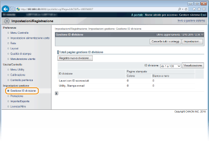 Fare clic su [Gestione ID divisione] e registrare o modificare gli ID reparto.