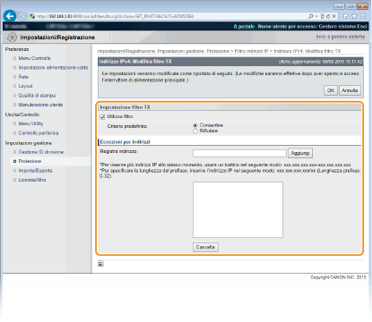 Se gli indirizzi IP sono immessi in modo non corretto, potrebbe non essere possibile accedere alla macchina dalla IU remota, in questo caso è necessario impostare <Filtro indirizzi> su <Disattivato>. Filtro indirizzi