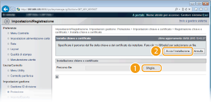 Fare clic su [Impostazioni chiave e certificato] per installare una coppia di chiavi, o su [Impostazioni Certificato CA] per installare un certificato emesso da CA.