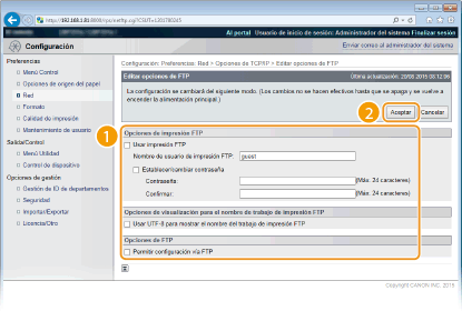 Para realizar la impresión mediante cliente FTP, marque la casilla de verificación. De lo contrario, quite la marca de la casilla de verificación.
