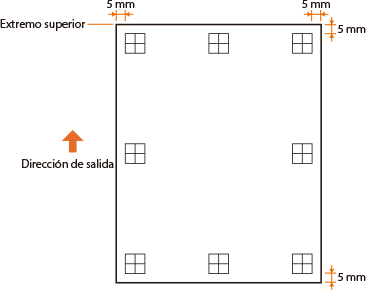 . Determine la dirección y la distancia para ajustar a partir de esas marcas. Si la posición de impresión es normal, todas las marcas se imprimen en una posición 5 mm del borde más cercano del papel.