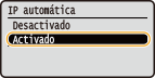 .Puede utilizar únicamente uno de los protocolos DHCP, BOOTP y RARP. Si el protocolo seleccionado se configura como <Activado>, los otros dos protocolos se configuran automáticamente como <Desactivado>.