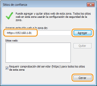 Asegúrese de que aparece "https://<dirección IP del equipo> o <nombre de host del equipo>.<nombre de dominio>/" y haga clic en [Agregar]
