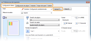 Haga clic en la pestaña [Configuración básica], [Configuración de página], [Acabado], [Origen del papel] o [Calidad] para especificar las opciones de impresión en cada pantalla según sea necesario. Varias opciones de impresión