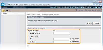 Para configurar un PIN, seleccione la casilla de verificación [Establecer PIN] e introduzca un número de hasta siete dígitos para el PIN en el cuadro de texto [PIN]. A modo de confirmación, introduzca el mismo número en el cuadro de texto [Confirmar].