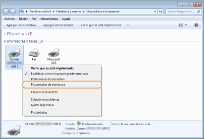 Haga clic con el botón derecho del ratón en el icono de impresora y haga clic en [Propiedades de impresora] o [Propiedades].