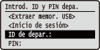 Cuando los usuarios intentan imprimir un archivo en el dispositivo de memoria USB o un documento almacenado en la tarjeta SD desde el panel de control, aparecerá la pantalla de autenticación. Introduzca el ID de departamento y el PIN, seleccione <Inicio de sesión> y pulse  .