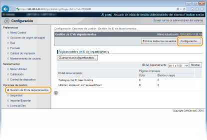 Seleccione la casilla de verificación [Utilizar Administración de ID de departamento] y haga clic en [Configuración], situado a su derecha.
