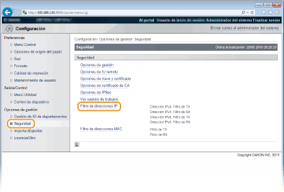 Si las direcciones IP se introducen de forma incorrecta, es posible que no pueda acceder al equipo desde la IU remota, en cuyo caso deberá establecer <Filtro de direcci.> en <Desactivado>. Filtro de direcci.