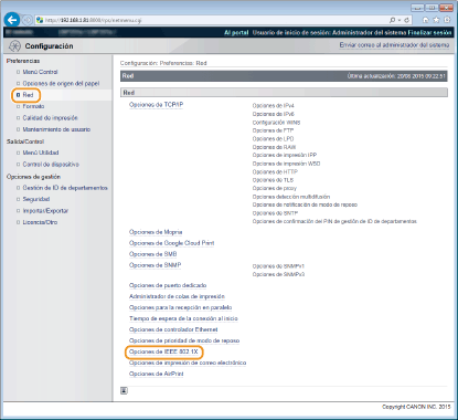 Uso del panel de controlTambién puede habilitar o deshabilitar la autenticación IEEE 802.1X desde el menú de configuración del panel de control. IEEE802.1X