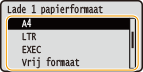 <Lade 2 papierformaat> tot <Lade 4 papierformaat> worden weergegeven wanneer de optionele papiertoevoer is geïnstalleerd.