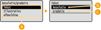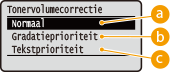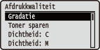 De instellingen over afdrukkwaliteit inclusief de gradatie en tonerdichtheid worden in een lijst geplaatst en kort toegelicht. Standaardinstellingen worden aangegeven met een dolksymbool (
