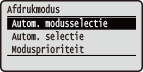 Als alle afdrukmodi zijn ingesteld op <Uit>, werkt het apparaat in de afdrukmodus die is opgegeven voor <Modusprioriteit>.
