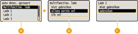Sterretjes (*)Instellingen die zijn gemarkeerd met een sterretje (*), worden niet weergegeven, afhankelijk van andere instellingen en het feit of er een optionele papiertoevoer in het apparaat is geïnstalleerd.