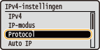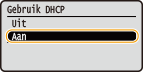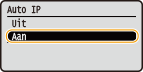 .U kunt slechts één van de protocollen DHCP, BOOTP, en RARP gebruiken. Als het geselecteerde protocol wordt ingesteld op <Aan>, worden de andere twee protocollen automatisch ingesteld op <Uit>.