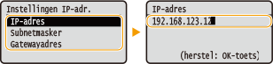 Geef het IP-adres, het subnetmasker en het gateway-adres (of de standaardgateway).