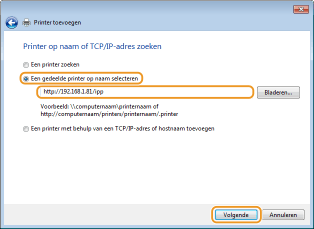Voor het gebruik van IPP voert u 'http://<IP-adres van het apparaat>/ipp' in voor de verbindingsbestemming.