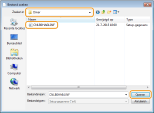 Geef de map op waarin de printerstuurprogramma's zijn opgeslagen, selecteer het INF-bestand en klik op [Openen].