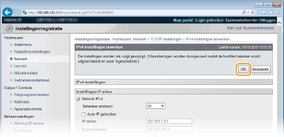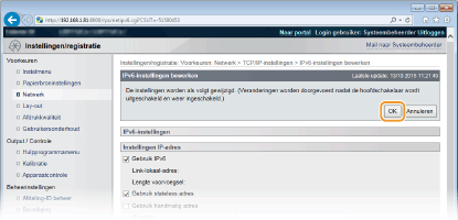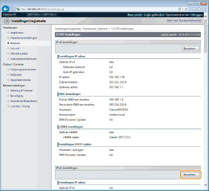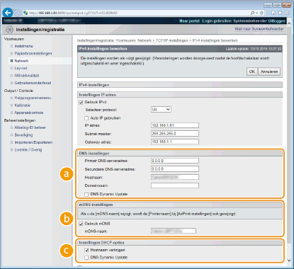 Schakel dit selectievakje in als u de DNS-records dynamisch wilt bijwerken, wanneer het IP-adres van het apparaat verandert. Als u één of meer adrestypen wilt opgeven die u wilt registreren op de DNS-server, schakelt u het selectievakje [Registreer handmatig adres], [Registreer stateful adres] of [Registreer stateless adres] in. [mDNS-instellingen]/[Instellingen DHCP-opties][Gebruik mDNS]
