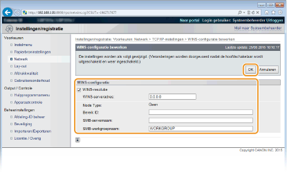 Als het IP-adres van de WINS-server wordt verkregen van een DHCP-server, heeft het verkregen IP-adres prioriteit boven het IP-adres dat is ingevoerd in het vak [WINS-serveradres].