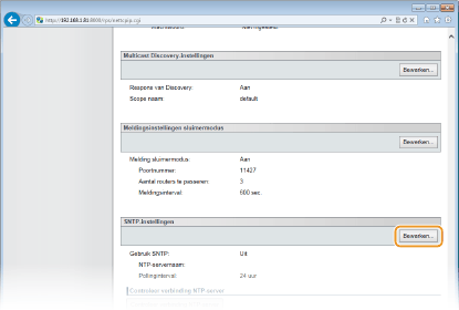 Communicatie met de NTP-/SNTP-server testenU kunt de communicatiestatus bij de geregistreerde server zien door te klikken op [Instellingen/registratie]