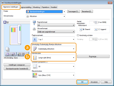 U kunt enkelzijdig en dubbelzijdig afdrukken. De standaardinstelling is [Dubbelzijdig afdrukken]. Pas de instelling desgewenst aan.