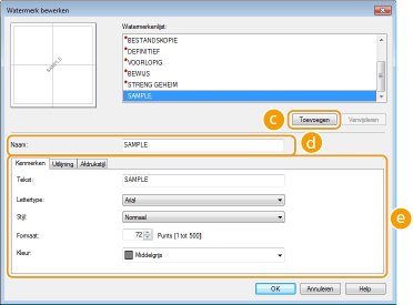 Klik op deze tabbladen om de tekst, kleur of afdrukpositie van het watermerk op te geven. Klik voor meer informatie op [Help] in het printerstuurprogramma.