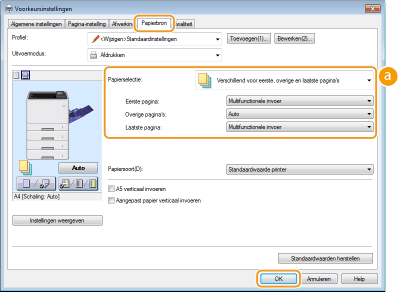 Tevens kunt u het papier opgeven voor de pagina die volgt op de voorpagina, en het papier opgeven in [Verschillend voor eerste, overige en laatste pagina's]. U kunt ook afdrukken door de papiersoort in te voeren in [Papiersoort].