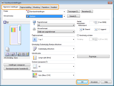 Klik op de tabbladen [Algemene instellingen], [Pagina-instelling], [Afwerking], [Papierbron], of [Kwaliteit] om de afdrukinstellingen op ieder scherm naar behoefte op te geven.