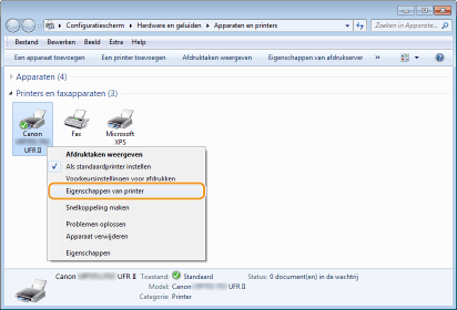 Klik met de rechtermuisknop op het printerpictogram en klik op [Eigenschappen van printer] of [Eigenschappen].
