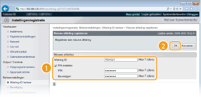 Activeer het selectievakje [Gebruik PIN-bevestiging voor Afdeling-ID beheer]