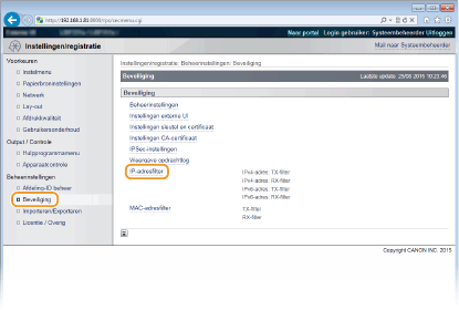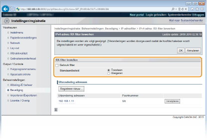 Als u IP-adressen verkeerd invoert, kunt u het apparaat mogelijk niet bereiken vanuit de UI op afstand. In dat geval stelt u <Adresfilter> in op <Uit>. Adresfilter