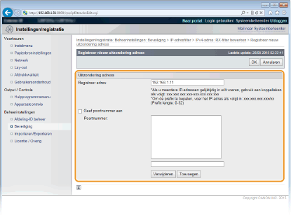 Geef het IP-adres (of het bereik van IP-adressen) op in [Registreer adres] en klik op [Toevoegen].