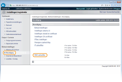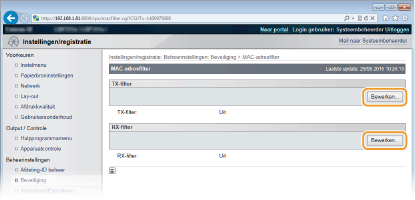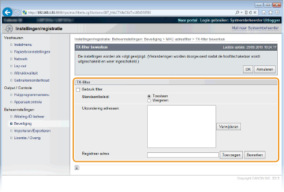 Als u MAC-adressen verkeerd invoert, kunt u het apparaat mogelijk niet bereiken vanuit de UI op afstand. Om dat op te lossen, moet u <Adresfilter> instellen op <Uit>. Adresfilter