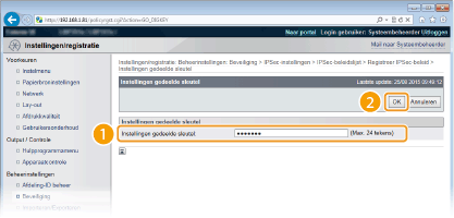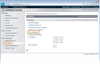 Het bedieningspaneel gebruikenTevens kunt u IPSec communicatie in- of uitschakelen in het instellingenmenu van het bedieningspaneel. IPSec