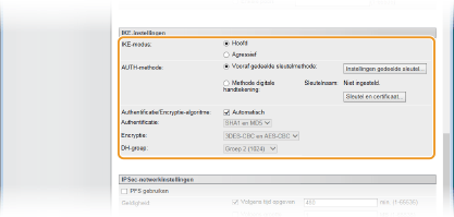 Voordat u IPSec communicatie-instellingen configureertControleer de IPSec instellingen in het besturingssysteem waarmee het apparaat zal communiceren. Een onjuiste combinatie van besturingssysteem- en apparaatinstellingen schakelt de IPSec-communicatie uit.