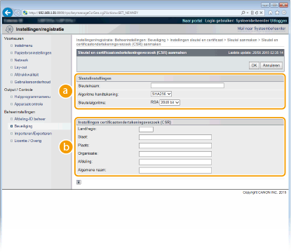Een sleutelpaar kan worden gegenereerd met het apparaat wanneer dat nodig is voor versleutelde communicatie via Transport Layer Security (TLS). U kunt TLS gebruiken wanneer u toegang wenst tot het apparaat via de externe UI of IPP Print verricht. Er kunnen maximaal acht sleutelparen (inclusief de vooraf geïnstalleerde paren) worden geregistreerd op het apparaat. Zelf-gesigneerde certificaten worden gebruikt met sleutelparen die zijn gegenereerd in 'Netwerkcommunicatie'. Met een 'Sleutel en certificaatondertekeningsverzoek (CSR)' kunt u een CA-uitgegeven digitaal certificaat voor het sleutelpaar aanvragen, dat is gegenereerd door het apparaat.