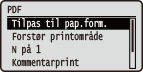 Alle indstillinger om PDF-filer, der er tilgængelige til direkte USB-udskrivning og direkte udskrivning, vises med korte beskrivelser. Standardindstillingerne er angivet med en daggert (