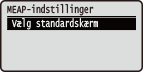 Indstillingspunkterne om hovedskærmen på MEAP vises med korte beskrivelser. Standardindstillingerne er angivet med en daggert (