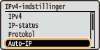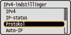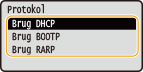 Vælg <Brug DHCP>, <Brug BOOTP> eller <Brug RARP>, og tryk på