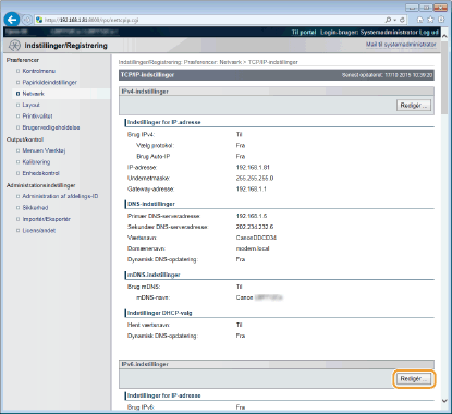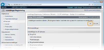 Kontrol af, om indstillingerne er korrekteSørg for, at skærmbilledet for Brugerinterface til fjernbetjening kan vises sammen med din computer ved at bruge maskinens IPv6-adresse. Brug af Brugerinterface til fjernbetjening