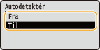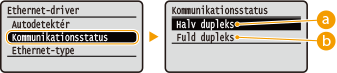 Vælg <Halv dupleks> eller <Fuld dupleks> ![]() ![]() <Halv dupleks>Sender og modtager kommunikationsdata skiftevis. Vælg, om maskinen er tilsluttet en netværksenhed, der anvender halv dupleks.