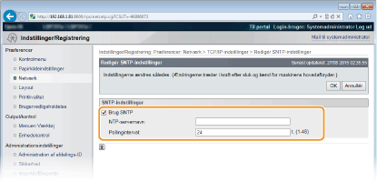 Maskinens SNTP understøtter både NTP- (version 3) og SNTP-servere (version 3 og 4).