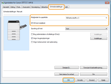 Du kan bruge PCL6-printerdriveren samt UFRII-printerdriveren. De tilgængelige udskriftsindstillinger varierer afhængigt af printerdriveren. Du kan få flere oplysninger ved at klikke på [Hjælp] på hver enkelt skærm for printerdriveren.
