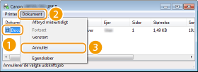 Annullering fra Brugerinterface til fjernbetjeningDu kan annullere udskrivning via siden [Jobstatus] på Fjern-UI: Kontrol af den aktuelle status for dokumenter til udskrivning