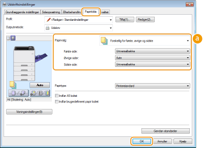 Du kan også angive papiret for den side, der følger efter omslaget, samt angive papiret i [Forskellig for første, øvrige og sidste]. Du kan også udskrive ved at angive papirtypen i [Papirtype].