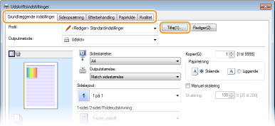 Klik på fanerne [Grundlæggende indstillinger], [Sideopsætning], [Efterbehandling], [Papirkilde] eller [Kvalitet] for at angive udskriftsindstillingerne på hver enkelt skærm efter behov. Forskellige udskriftsindstillinger